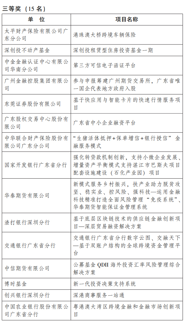 2020年广东金融创新奖三等奖名单: