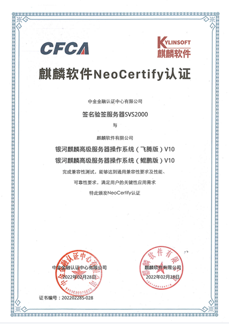 CFCA签名验签服务器取得麒麟软件NeoCertify认证