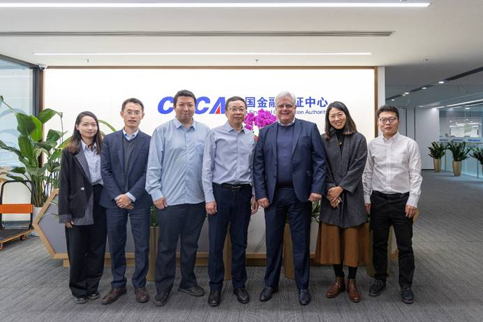 11月8日,全球法人识别编码基金会 (Global Legal Entity Identifier Foundation, 简称GLEIF) 首席执行官斯蒂芬·伍尔夫 (Stephan Wolf)、亚太地区业务发展负责人谭雪与中国区负责人张彦钊来到中国金融认证中心(CFCA)访问交流。本次交流主要议题为拓展全球法人识别编码(LEI)与可验证全球法人识别编码(vLEI)在中国的应用发展,共建国际互联互通的数字信任生态。