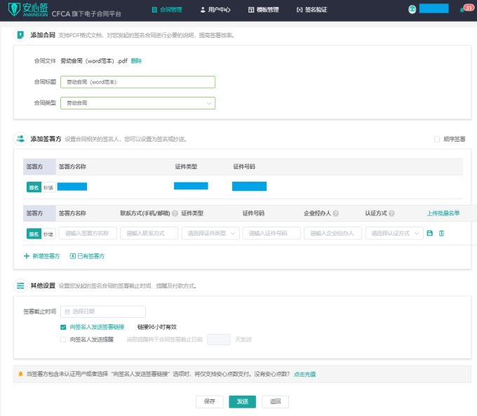 企业可以在安心签网站签署电子文件。安心签也支持向签署人发送签署链接,方便签署人在手机上快速进行合同签署。