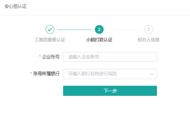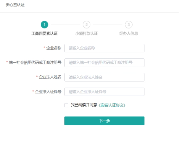 账户创建后,登录安心签网站认证企业真实性。点击“立即认证”,输入企业基本信息、企业法定代表人信息、企业账户信息、企业经办人信息。安心签验证成功后,企业账户升级为实名账户,同时为企业生成一张数字证书,企业即可在安心签网站发起及签署合同。